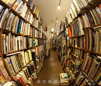 32店の古書店について、パノラマ写真で店内を眺められます。気になる書店に、次々と立ち寄りながら歩き回る神保町サーフィンを仮想体験できます。